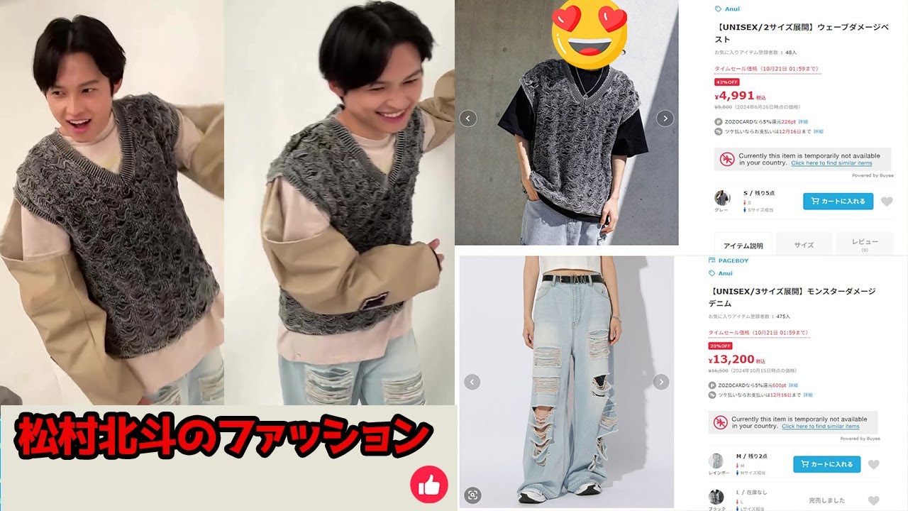ファッションに詳しいファンの間では、このベストが特に注目を集めています。その理由は、シンプルでありながらも視覚的に強いインパクトを与えるデザインだからです。ウェーブデザインのダメージ加工は、普段のコーディネートに少し冒険心を取り入れたい人にもおすすめです。ファンからは「このベストが北斗の知的で洗練されたイメージにぴったり」との声が多く寄せられています。