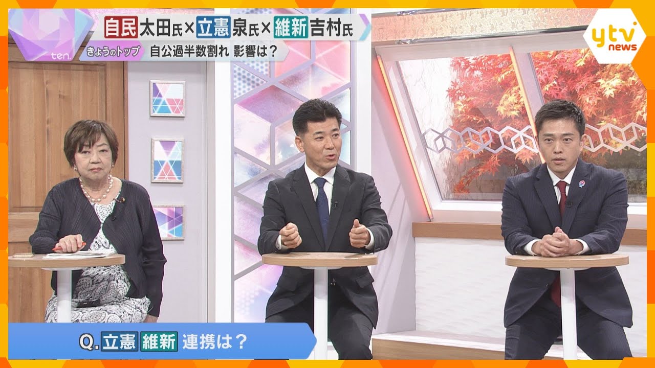 衆院選から一夜明けた28日、読売テレビの「かんさい情報ネットten.」に、日本維新の会の吉村洋文共同代表、立憲民主党の泉健太前代表、自民党の太田房江参院議員が出演しました。