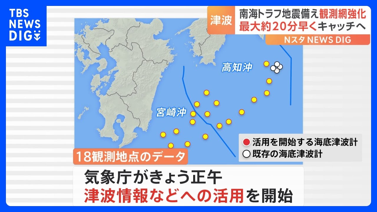 高知沖~宮崎沖の津波を最大約20分早くキャッチへ 南海トラフ地震に備え観測網強化 気象庁が21日から活用開始 津波情報発表の迅速化などに期待|TBS NEWS DIG