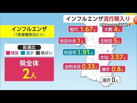 秋田県内でインフルエンザが流行期入りした。県内のインフルエンザの患者数が前週の3.2倍に増加し、流行の目安を超えた。新型コロナウイルスの患者数も増加していて注意が必要だ。