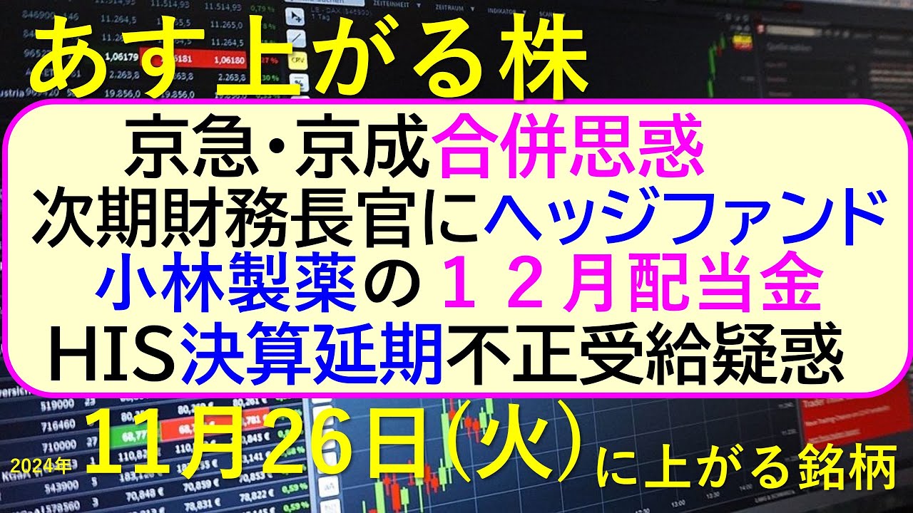 あす上がる株 2024年11月26日(火)に上がる銘柄。HISが不正受給疑惑。京急・京成の合併思惑。次期財務長官はヘッジファンド。小林製薬の配当。~最新の日本株情報。高配当株の株価やデイトレ情報~
