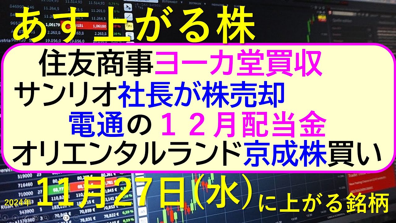 あす上がる株 2024年11月27日(水)に上がる銘柄。住友商事がヨーカ堂買収。サンリオ社長が株売却。オリエンタルランドが京成株買い。電通の配当金。~最新の日本株情報。高配当株の株価やデイトレ情報~