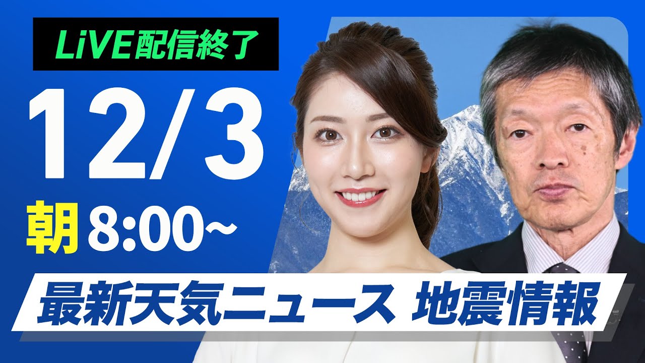 【ライブ】最新天気ニュース・地震情報2024年12月3日(火)/北日本や北陸は雨 関東以西は日差し暖か〈ウェザーニュースLiVEサンシャイン・魚住 茉由/飯島 栄一〉