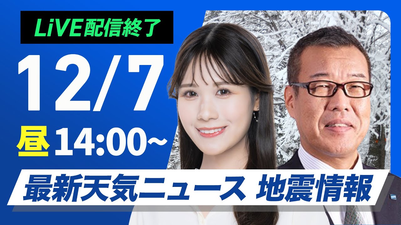 【ライブ】最新天気ニュース・地震情報 2024年12月7日(土)/〈ウェザーニュースLiVEアフタヌーン・戸北 美月・森田 清輝〉