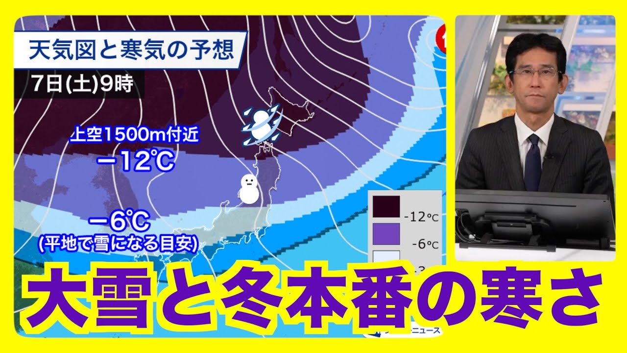 二十四節気「大雪(たいせつ)」の今日12月7日(土)は、暦どおり冬型の気圧配置が強まり強い寒気が南下します。北日本の日本海側は雪、北陸では雨の強まりに注意してください。晴れる太平洋側も含め、全国的に冬本番の寒さになります。