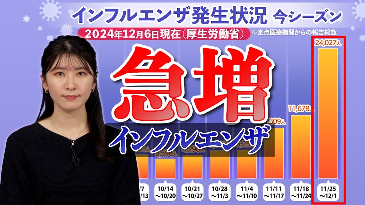 12月6日(金)、厚生労働省は2024年11月25日〜12月1日のインフルエンザ発生状況を発表しました。
