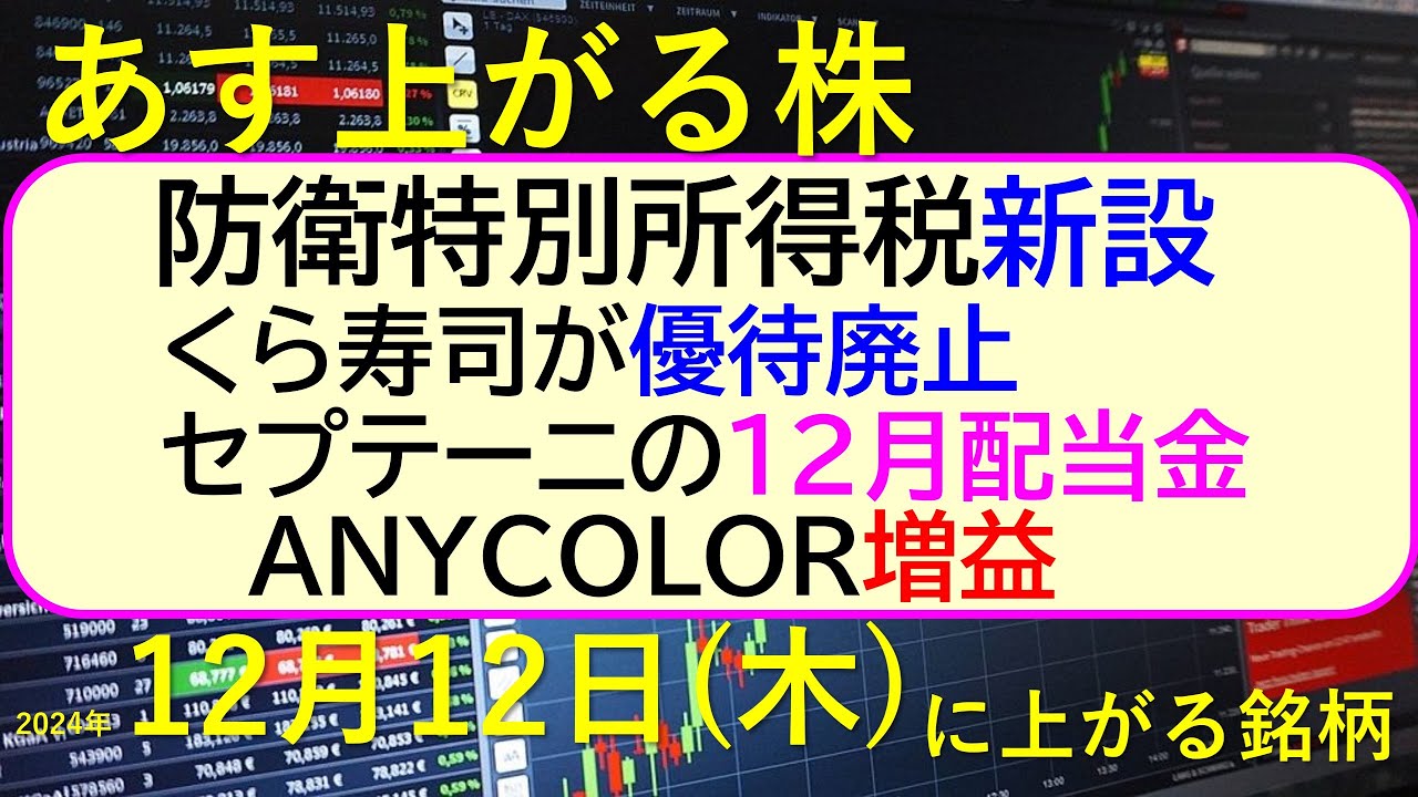 あす上がる株 2024年12月12日(木)に上がる銘柄。防衛特別所得税を新設。くら寿司が優待廃止。エニーカラーは増益。セプテーニの12月配当金~最新の日本株情報。高配当株の株価やデイトレ情報~