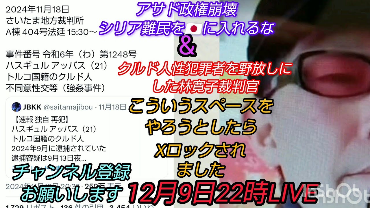 【言論封殺】「アサド政権崩壊シリア難民を🇯🇵に入れるな&性犯罪者を自由にした林寛子判事」こういうスペースをやろうとしたらXがロックされまして💢💢💨 #裁判可視化 #私たちの存在を消さないで