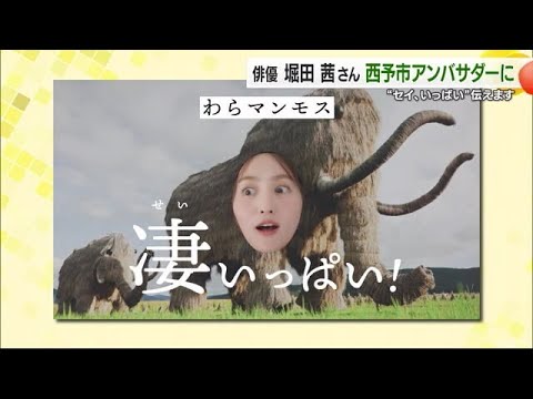 動画で西予市宇和町のシンボル「わらマンモス」をPRしているのは、モデルで俳優の堀田茜さん。キャッチフレーズは「セイ、いっぱい!西予市」です。
