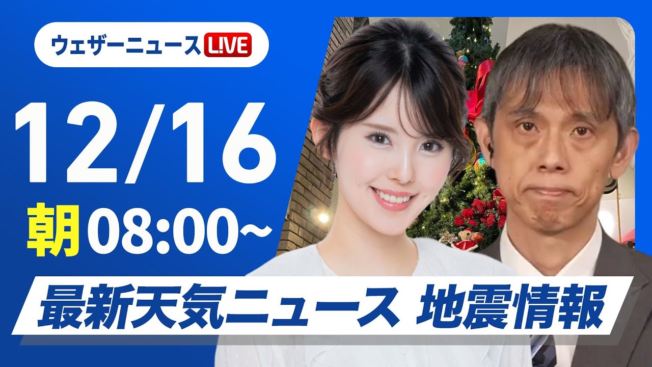 【ライブ】最新天気ニュース・地震情報 2024年12月16日(月)/日本海側は雪や雨の強まりに注意 太平洋側は青空広がる<ウェザーニュースLiVEサンシャイン・小川 千奈/芳野 達郎>