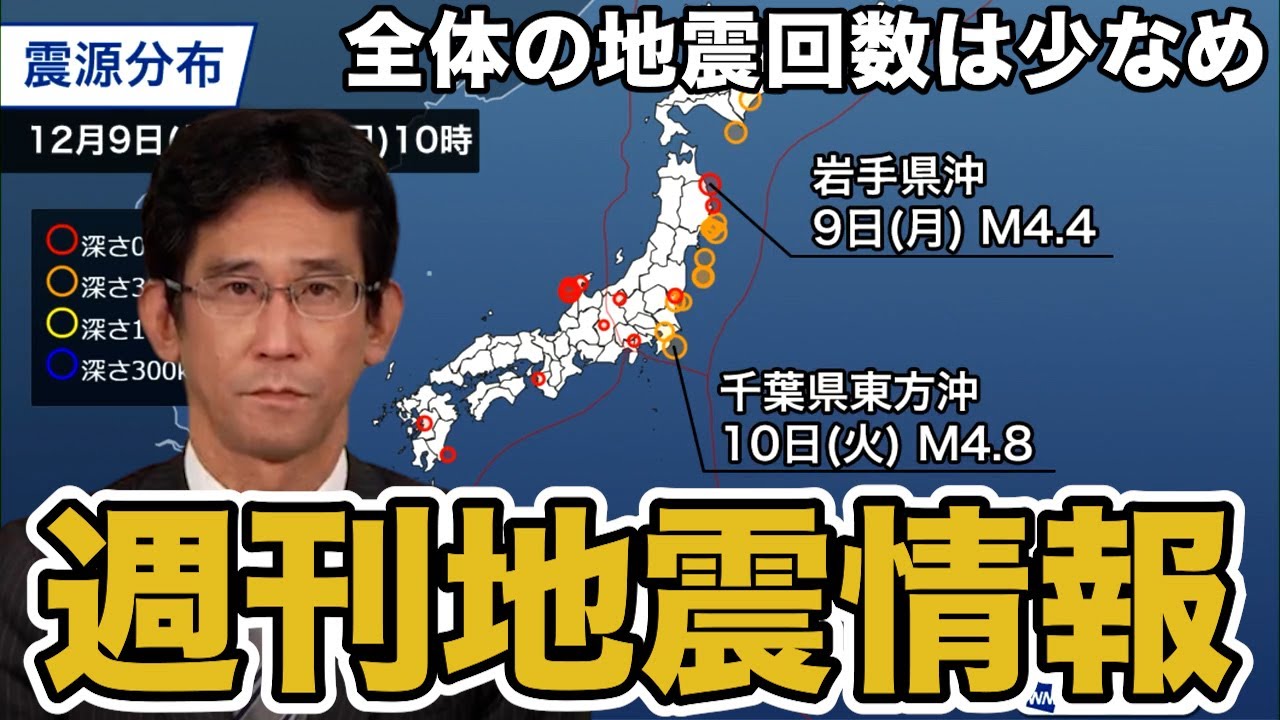 この1週間に国内で観測された有感地震の回数は、前週に比べると少ない水準です。東北の太平洋沿岸でやや地震が目立ちました。震度3以上の地震は1回発生しています。(12月9日〜15日10時の集計)