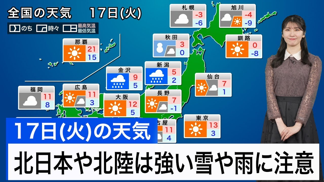 17日(火)も日本付近は冬型の気圧配置が続きます。北陸から北の日本海側は強まる雪や雨にお気をつけください。