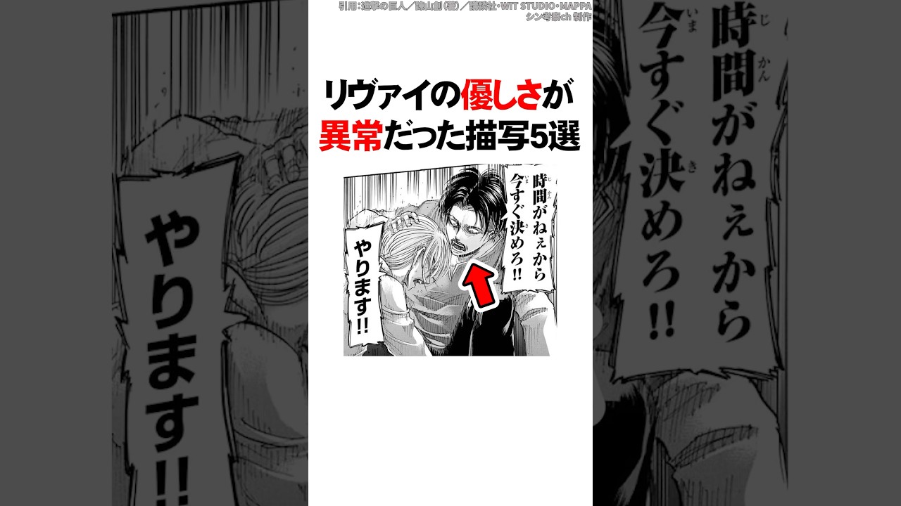 Share Facebook Twitter Pinterest LinkedIn リヴァイの優しさが異常だった描写5選【進撃の巨人】 #Shorts 今回はリヴァイの優しさが異常だった描写5選を解説します! <引用元> 進撃の巨人 (著)諫山創・講談社/「進撃の巨人」The Final Season製作委員会 VOICEVOX:四国めたん #進撃の巨人 #shorts animeアニメドラマアニメ進撃の巨人