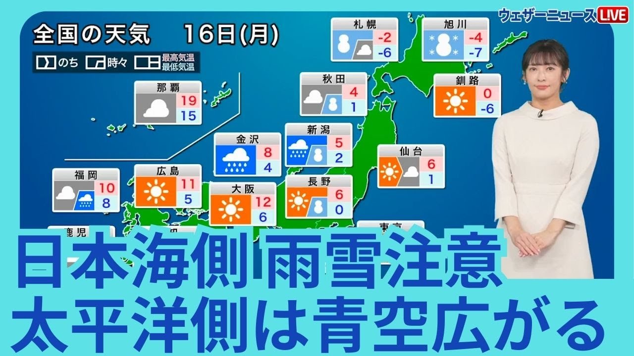 12月16日(月)の天気予報 日本海側は雪や雨の強まりに注意 太平洋側は青空広がる