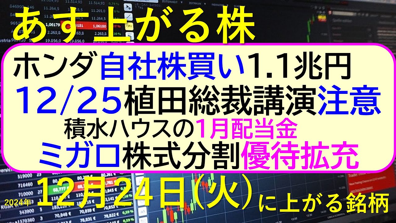 あす上がる株 2024年12月24日(月)に上がる銘柄。ホンダが24%自社株買い。12/25植田総裁に注意。ミガロ株式分割と優待拡充。積水ハウス配当~最新の日本株情報。高配当株の株価やデイトレ情報~