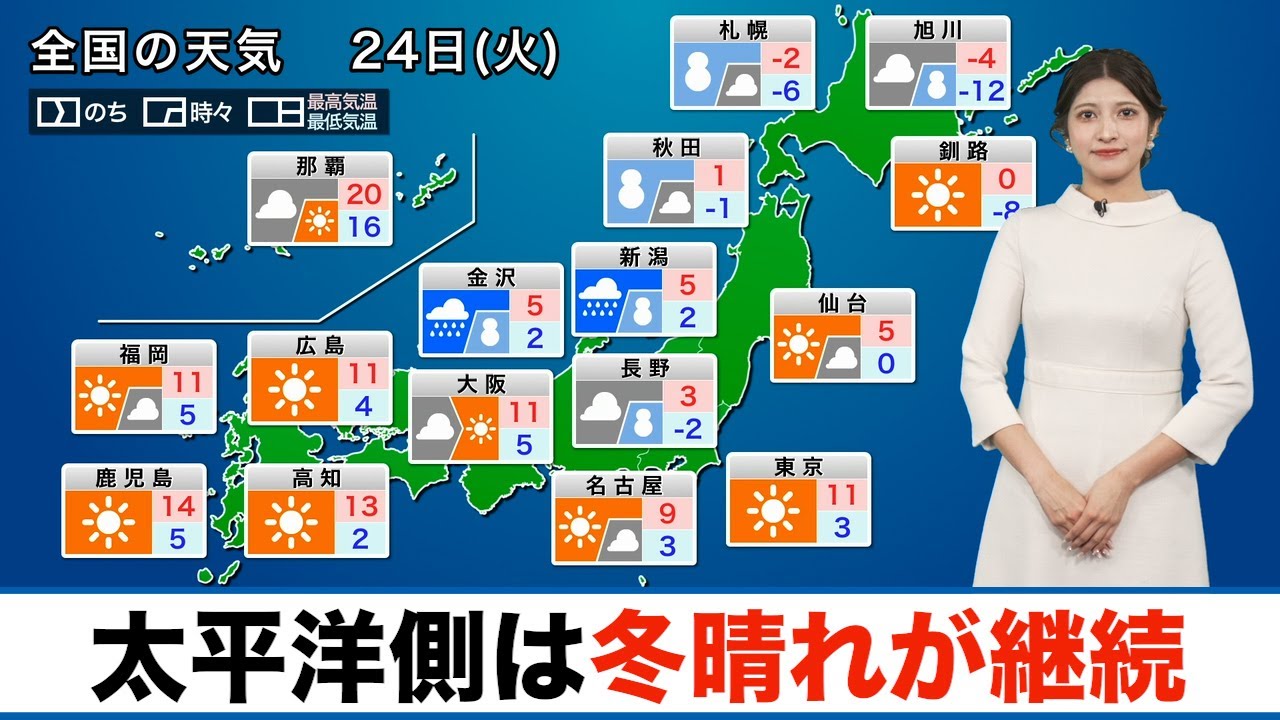 24日(火)は冬型の気圧配置が続きます。北日本日本海側や北陸エリアでは雪や雨が降って一時的に強まるおそれがあります。一方、西・東日本太平洋側ではスッキリと晴れて穏やかなクリスマスイブです。