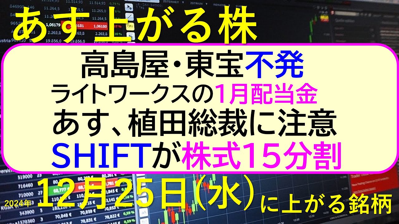 あす上がる株 2024年12月25日(水)に上がる銘柄。SHIFTが株式15分割。高島屋・東宝不発。あすの植田総裁に注意。ライトワークスの1月配当金~最新の日本株情報。高配当株の株価やデイトレ情報~