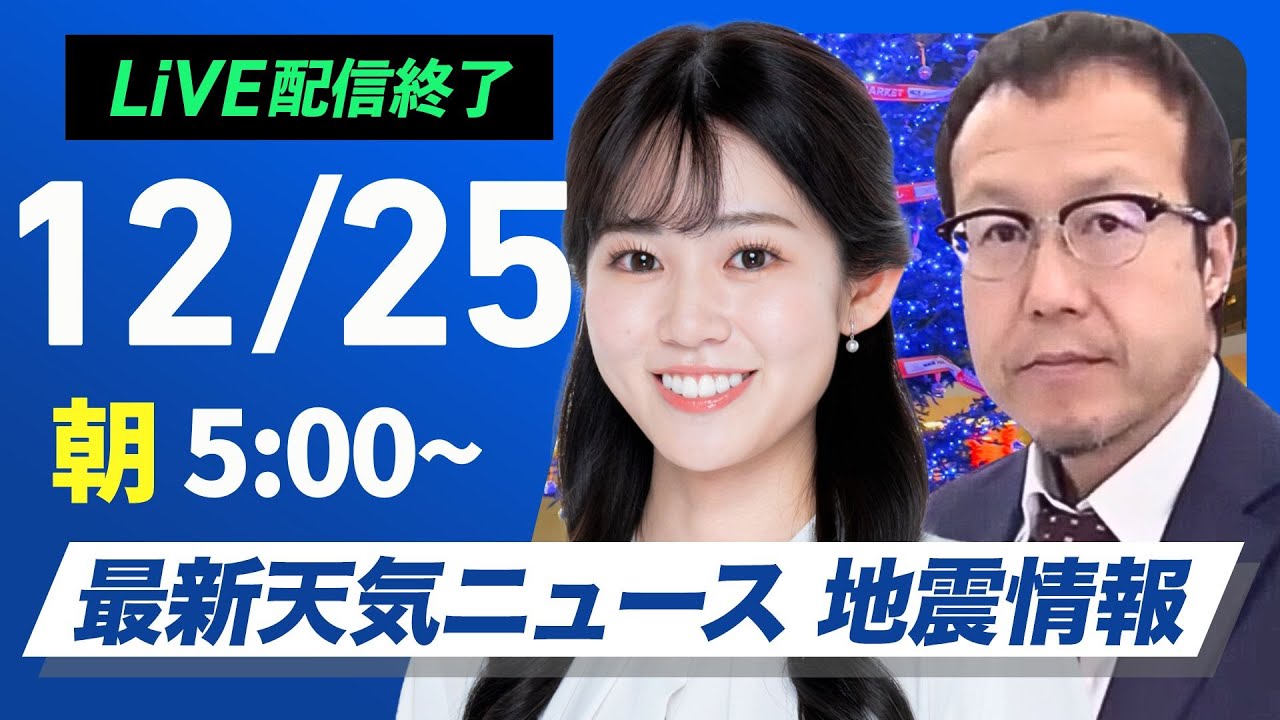 【ライブ】最新天気ニュース・地震情報2024年12月25日(水)/穏やかなクリスマス〈ウェザーニュースLiVEモーニング・青原桃香/内藤邦裕〉