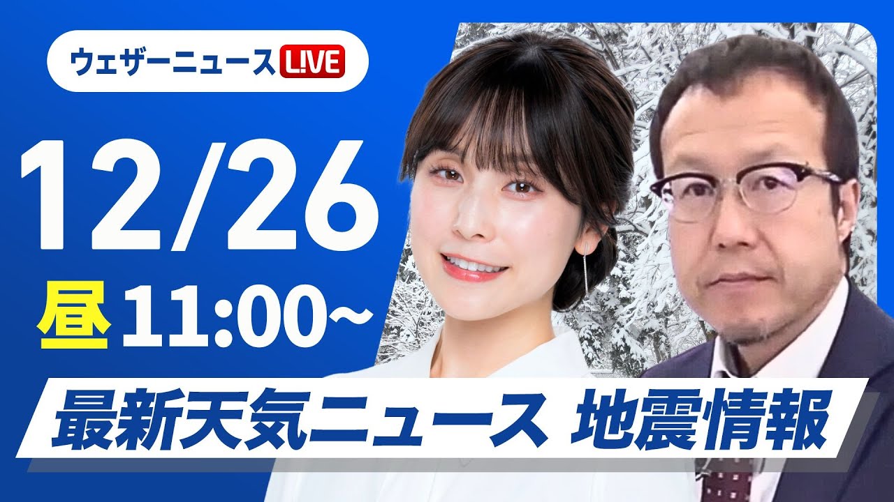 【ライブ】最新天気ニュース・地震情報2024年12月26日(木)/北日本中心に荒天 関東以西の太平洋側は暖か〈ウェザーニュースLiVEコーヒータイム・松雪彩花/内藤邦裕〉