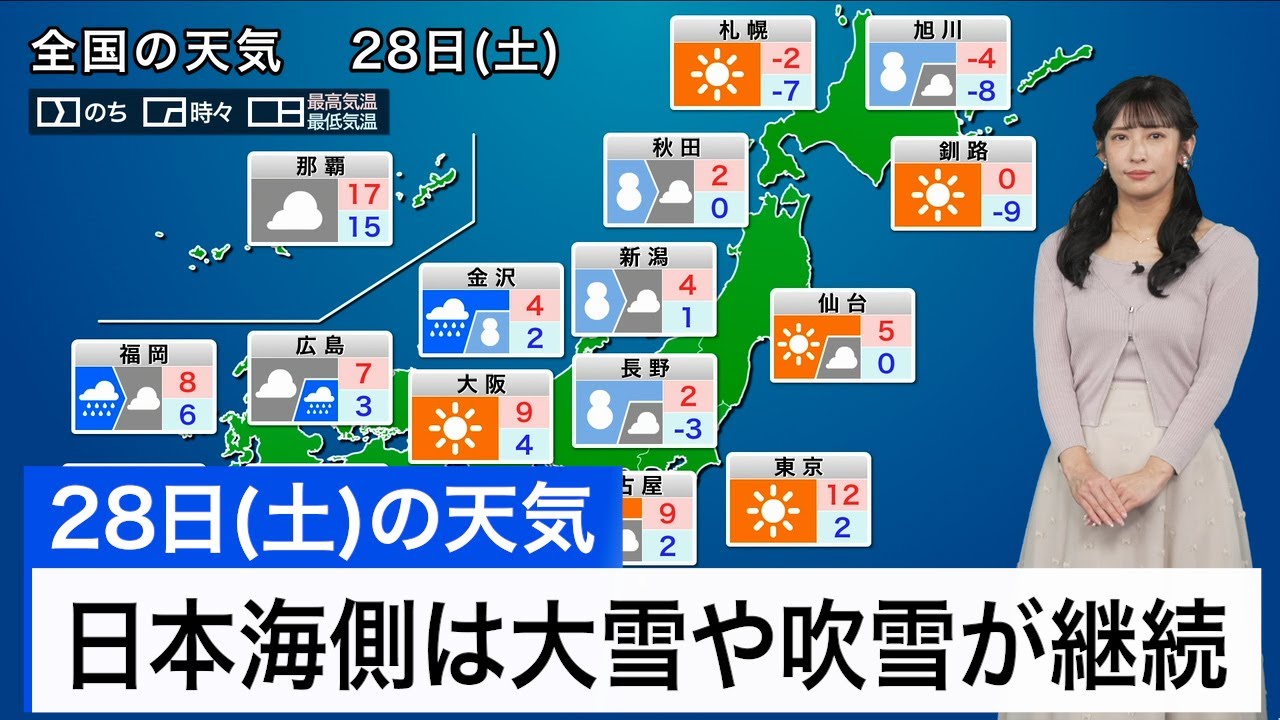 28日(土)も日本付近は冬型の気圧配置が続き、日本海側の地域は積雪の急増や吹雪による視界不良に警戒が必要です。西日本も広い範囲で雨や雪が降ります。関東は晴れて空気が乾燥しそうです。