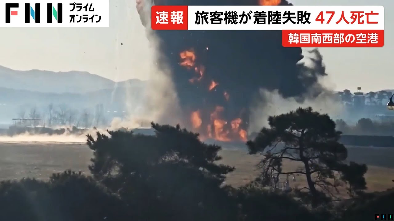 韓国南西部の空港で旅客機着陸失敗し炎上…滑走路外れ外壁に衝突これまで62人死亡 犠牲者さらに増える恐れ 乗客乗員に日本人なし