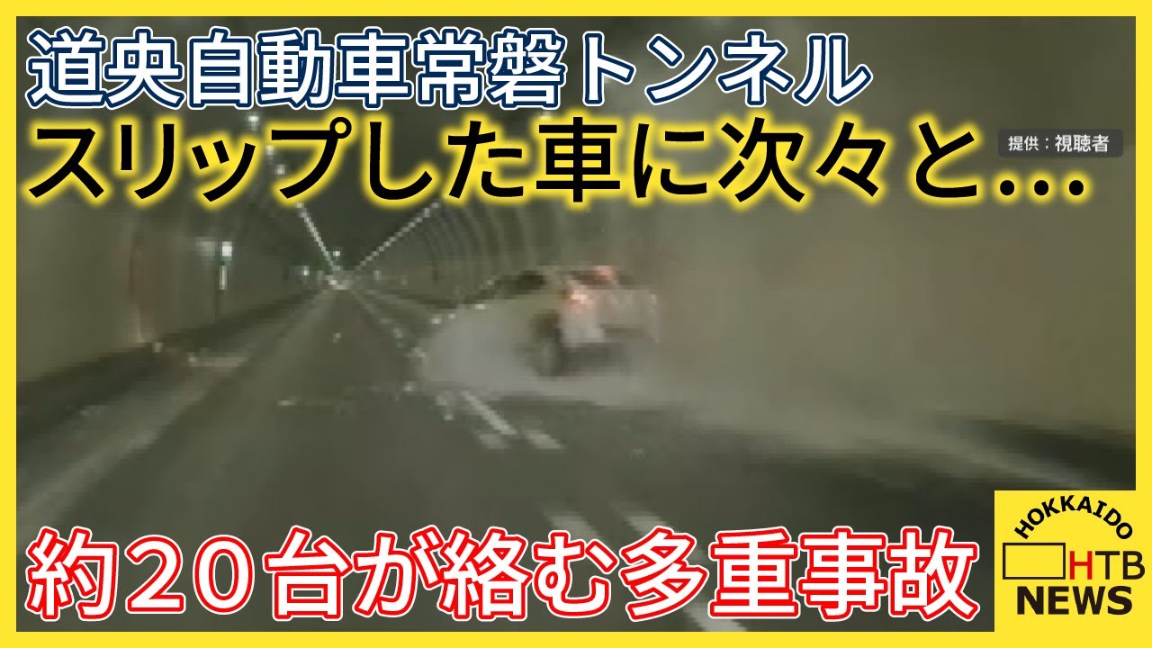 スリップして激突の瞬間 道央自動車道 常磐トンネル内 約20台が絡む多重事故 2名がけが