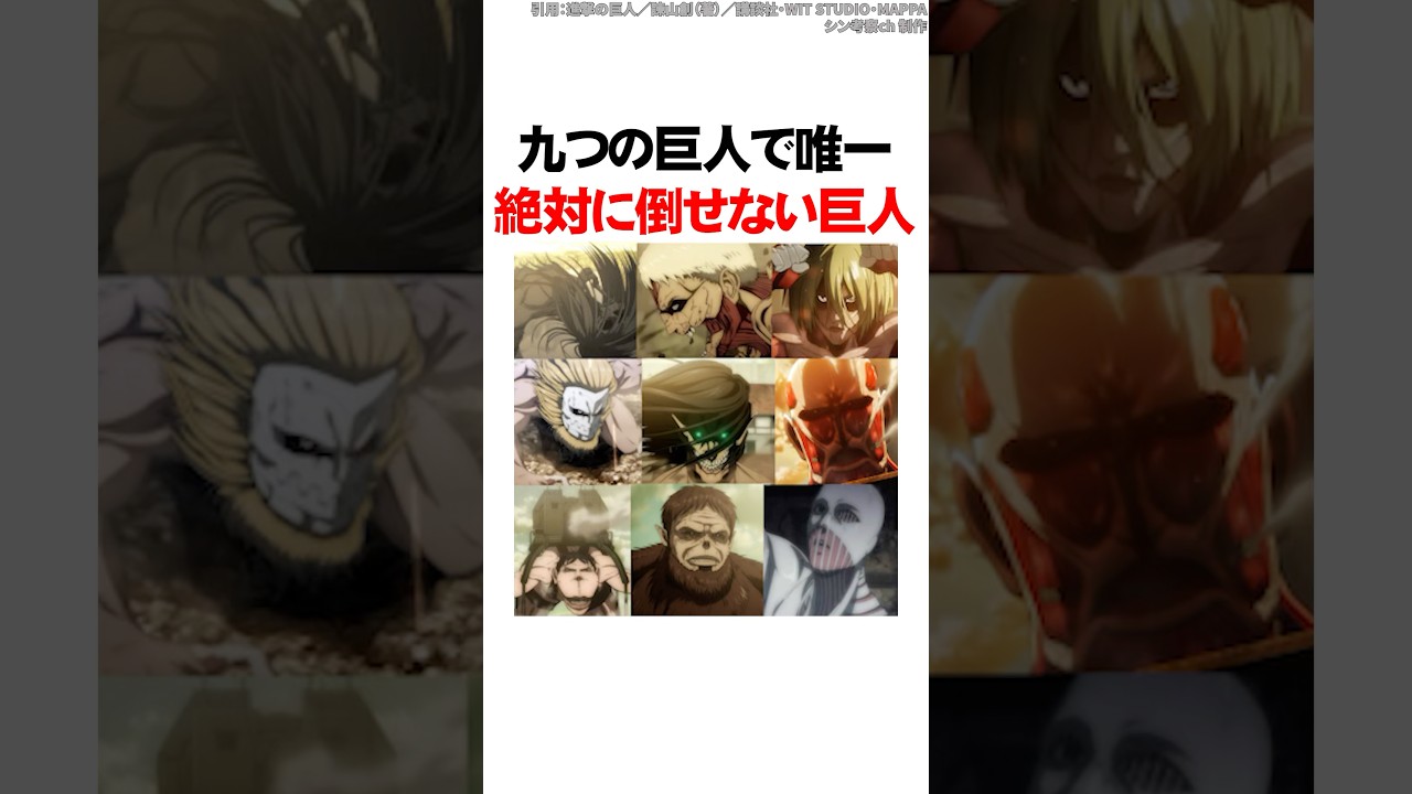 Share Facebook Twitter Pinterest LinkedIn 九つの巨人で唯一絶対に倒せない巨人【進撃の巨人】 #Shorts 今回は九つの巨人で唯一絶対に倒せない巨人を解説します! <引用元> 進撃の巨人 (著)諫山創・講談社/「進撃の巨人」The Final Season製作委員会 VOICEVOX:四国めたん #進撃の巨人 #shorts animeアニメドラマアニメ進撃の巨人