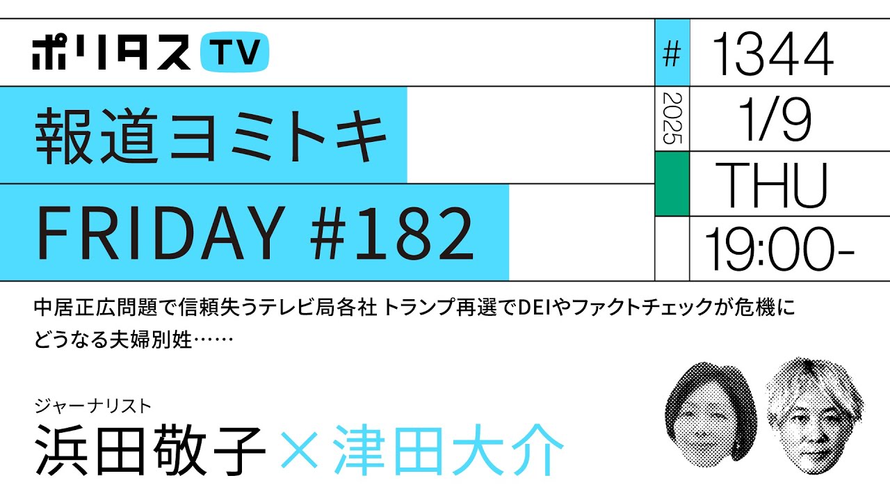 報道ヨミトキFRIDAY#182|中居正広問題で信頼失うテレビ局各社 トランプ再選でDEIやファクトチェックが危機に どうなる夫婦別姓…… ゲスト:浜田敬子(1/9)#ポリタスTV