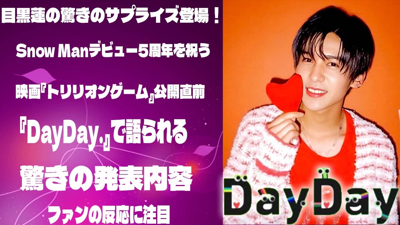目黒蓮の驚きのサプライズ登場!Snow Manデビュー5周年を祝う映画『トリリオンゲーム』公開直前、『DayDay.』で語られる驚きの発表内容 | メメの思い出目黒蓮の驚きのサプライズ登場!Snow Manデビュー5周年を祝う映画『トリリオンゲーム』公開直前、『DayDay.』で語られる驚きの発表内容 | メメの思い出 #目黒蓮 #メメ #SnowMan #メメの思い出 dramaSnow Mansnow manメンバージャニーズドラマドラマ公開予定メメメメの思い出目黒蓮目黒蓮インタビュー目黒蓮エピソード目黒蓮ファン目黒蓮最新情報