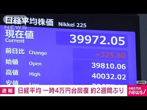 日経平均株価が約2週間ぶりに節目の4万円台を超えました。