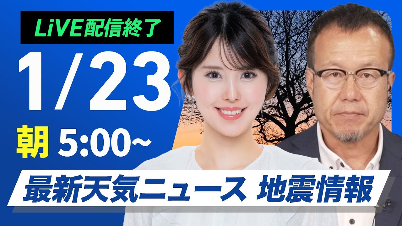 【ライブ】最新天気ニュース・地震情報 東北、北陸は局地的に強雨や雪 夜遅く沖縄本島で激しい雨のおそれ/2025年1月23日(木)5:00〜〈ウェザーニュースLiVE イブニング 駒木結衣・宇野沢達也〉