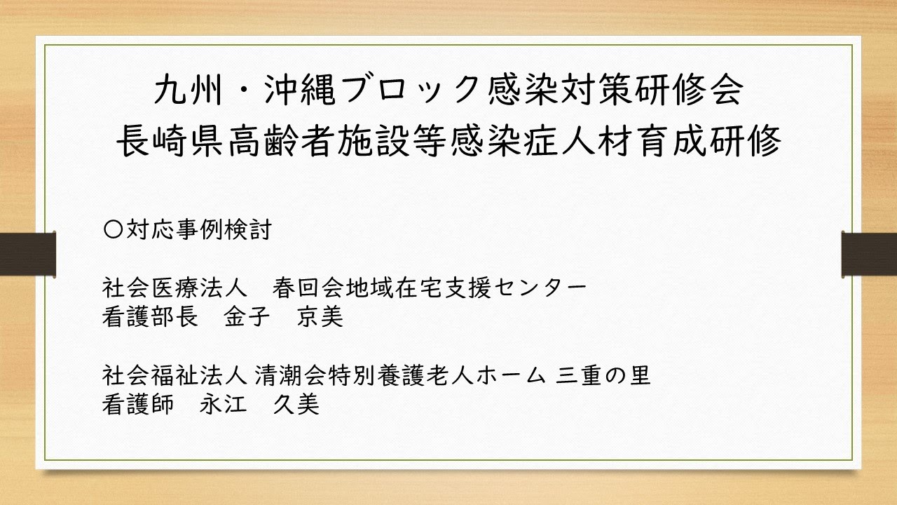 Share Facebook Twitter Pinterest LinkedIn 九州・沖縄ブロック感染対策研修会/長崎県高齢者施設等感染症人材育成研修⑤ 令和6年12月15日に出島メッセ長崎で開催しました「九州・沖縄ブロック感染対策研修会/長崎県高齢者施設等感染症人材育成研修」の録画映像です。 対応事例検討 社会医療法人 春回会地域在宅支援センター 看護部長 金子 京美 社会福祉法人 清潮会特別養護老人ホーム 三重の里 看護師 永江 久美 NEWS新型ウイルス検査で陽性
