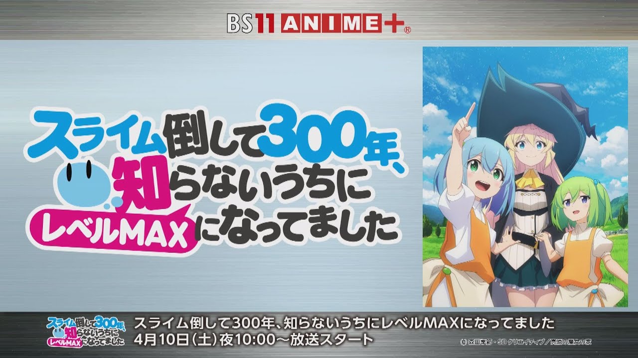 Share Facebook Twitter Pinterest LinkedIn TVアニメ「スライム倒して300年、知らないうちにレベルMAXになってました」 4月10日(土)よる10:00より、 BS11にて放送スタート! 番組ページはこちら⇒ 出演:悠木 碧、本渡 楓、千本木彩花、和氣あず未 BS11アニメ公式Twitter スライム倒して300年、知らないうちにレベルMAXになってました