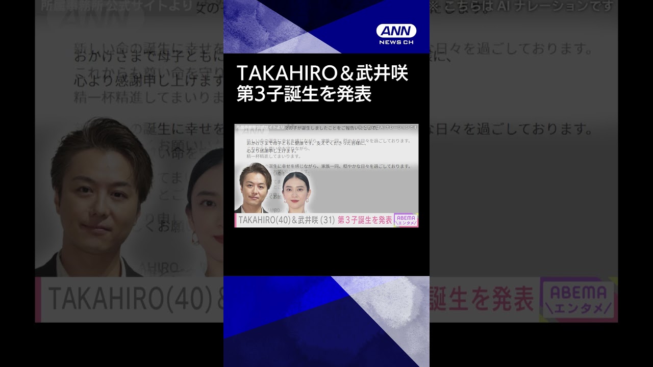 【ニュース】EXILEのTAKAHIRO(40)&武井咲(31) 第3子誕生を発表#shorts