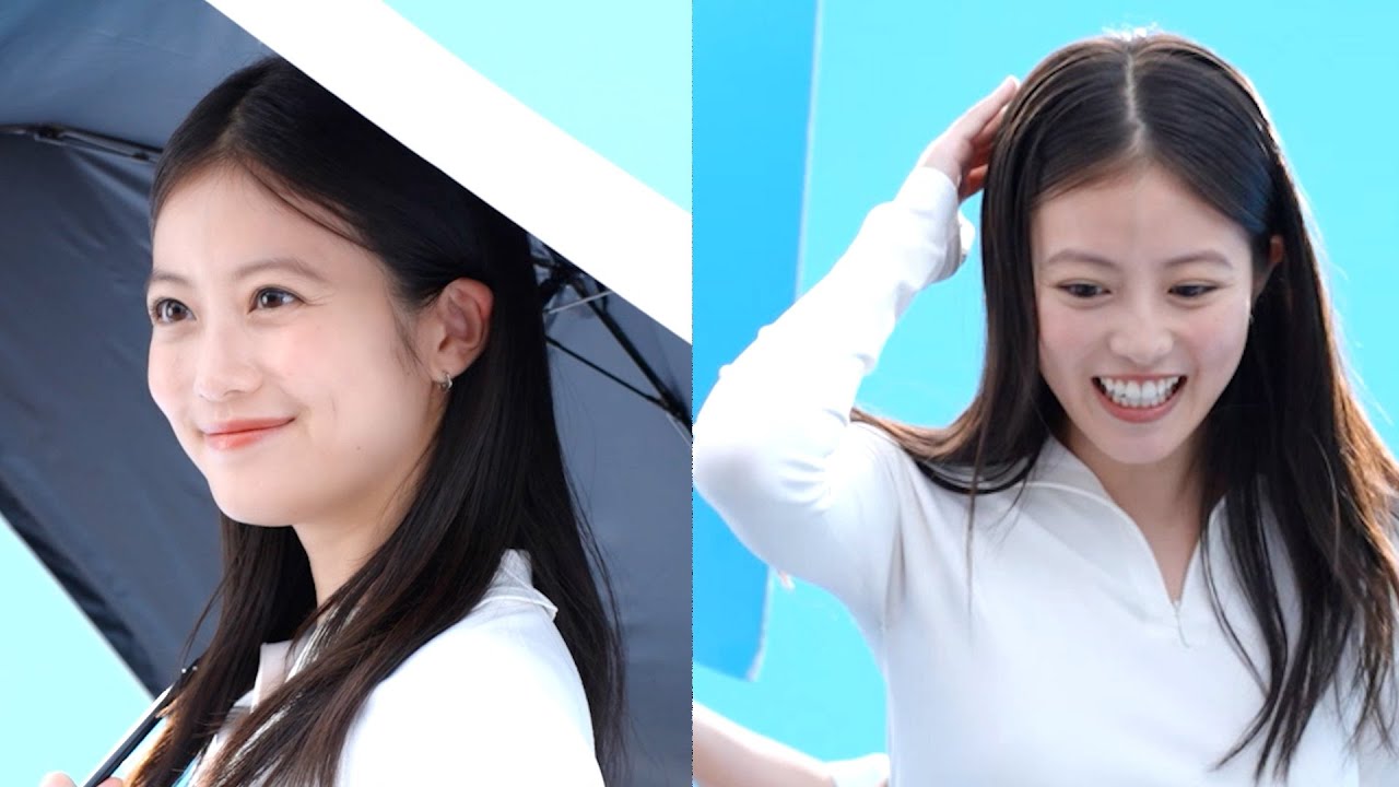 「マジカルテック プロテクション」の撮影では、白を基調としたトップスにパンツを合わせた都会的なスタイルで登場し、まるでランウェイのように颯爽と歩くカットや、巨大な傘の後ろからひょっこりと飛び出しカメラに駆け寄る姿など、今田さんの豊かな表情の変化に注目です。