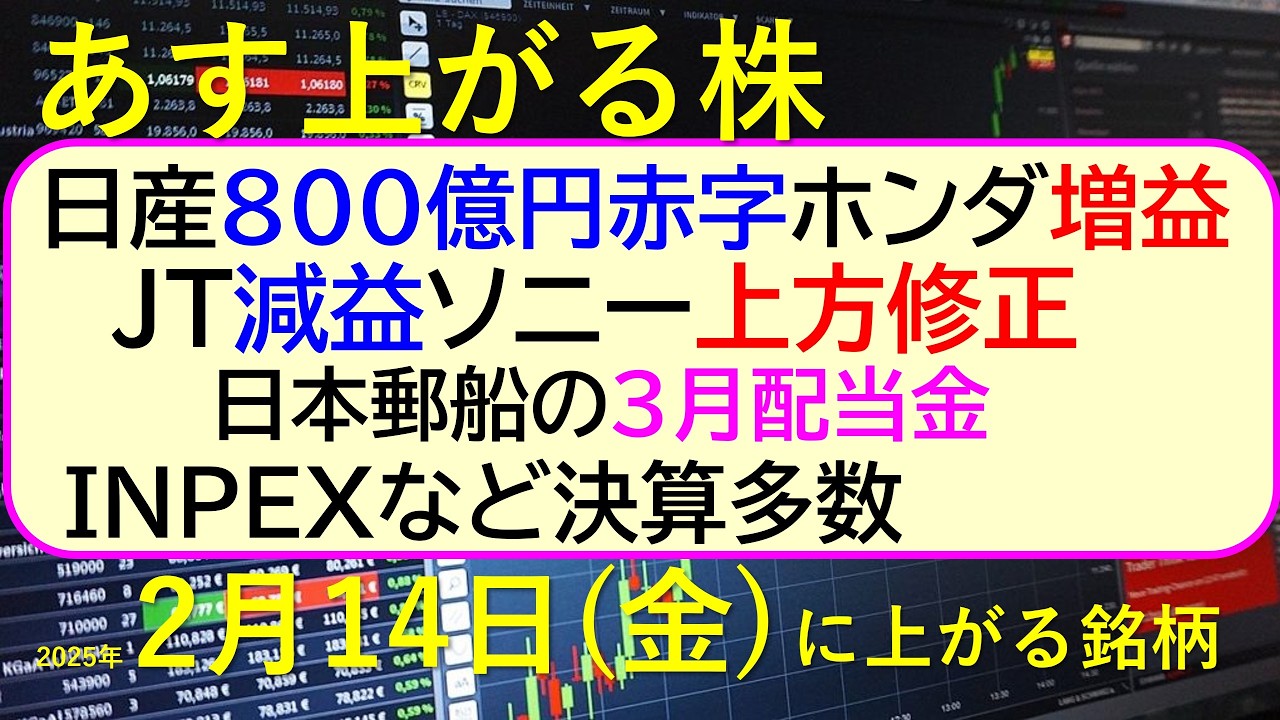 あす上がる株 2025年2月14日(金)に上がる銘柄。日産800億円赤字、S高S安高配当急落多発、ホンダ増益、JT減益、ソニー上方修正、日本郵船配当~最新の日本株情報。高配当株の株価やデイトレ情報~