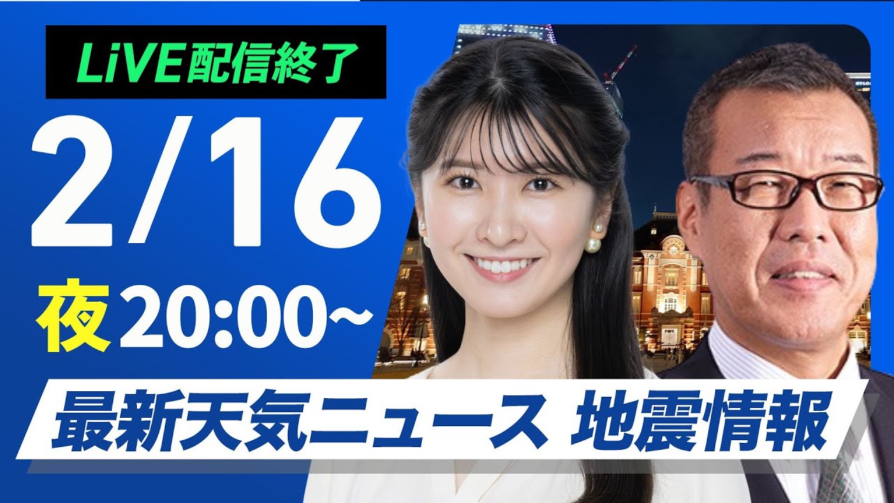 【ライブ配信終了】最新天気ニュース・地震情報2025年2月16日(日)/〈ウェザーニュースLiVEムーン・駒木 結衣/森田 清輝〉
