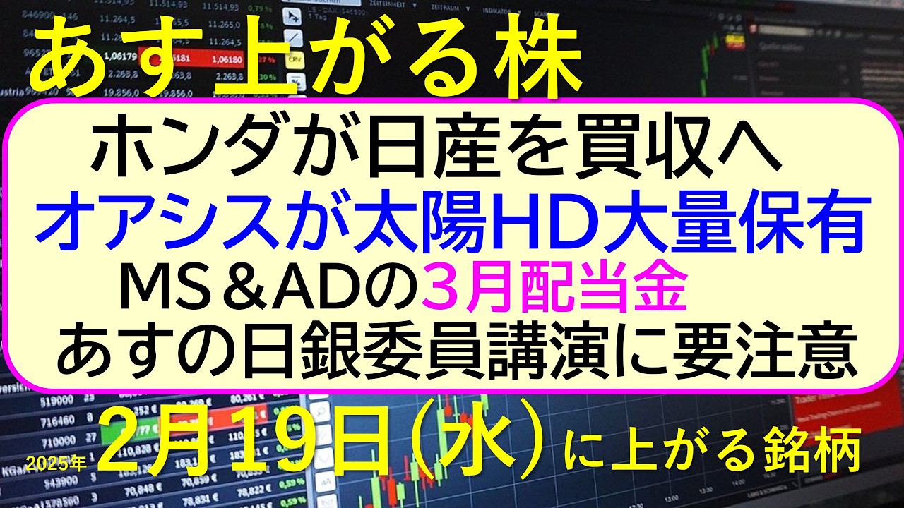 あす上がる株 2025年2月19日(水)に上がる銘柄。ホンダが日産を買収へ。オアシスが太陽HD大量保有。あすの日銀委員講演に要注意。MS&ADの配当金~最新の日本株情報。高配当株の株価やデイトレ情報~
