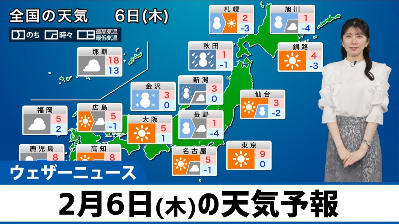 【2月6日(木)の天気予報】日本海側は大雪や吹雪に警戒 西日本は路面凍結のおそれ