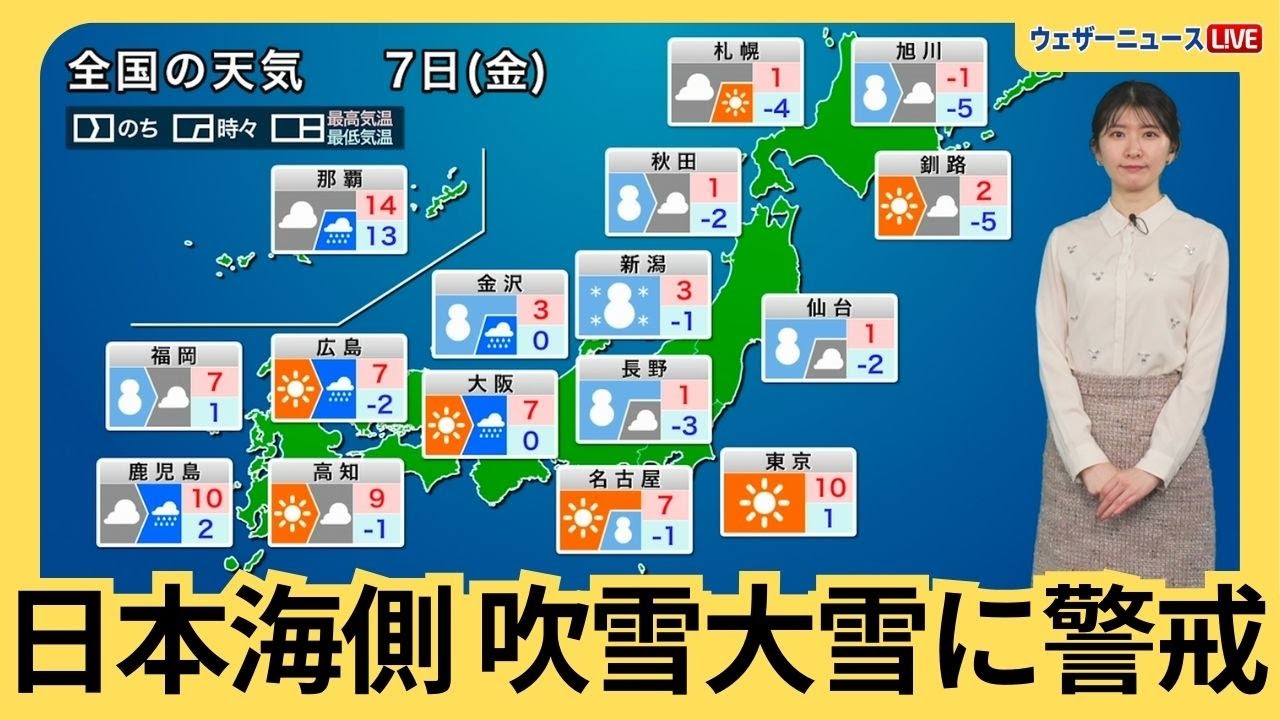 2月7日(金)の天気予報 日本海側は吹雪や大雪に要警戒 関東は晴れても風が冷たい