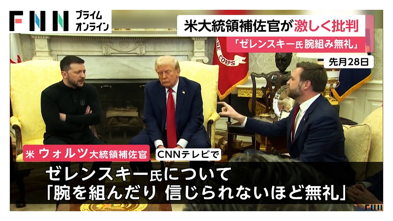 一方、アメリカのウォルツ大統領補佐官は2日、CNNテレビに出演し、決裂会談の時のゼレンスキー大統領について、「腕を組んだりして、信じられないほど無礼だった」と批判しました。