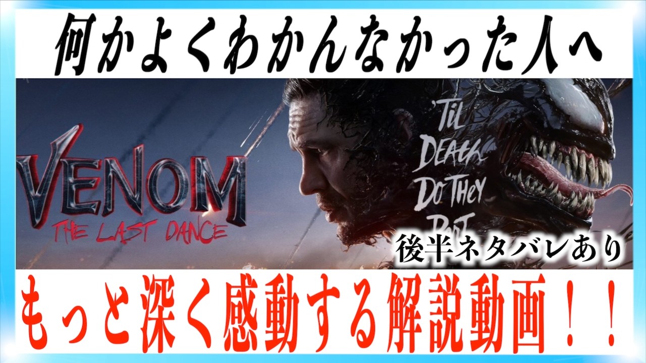 映画ヴェノム・ラストダンスもっと面白くなる解説動画!【ネタバレあり】チャンネル登録、高評価で応援してもらえると嬉しいです! ▼公式サイト https://www.venom-movie.jp ▼トムと監督の対談 ▼引用 https://variety.com/2022/film/news/venom-3-director-kelly-marcel-tom-hardy-1235417111/▼twitterもやっているので良ければ! @tutti_eiga movieおすすめスパイダーマンツッチレビュー動画感想映画映画の解説紹介解説面白