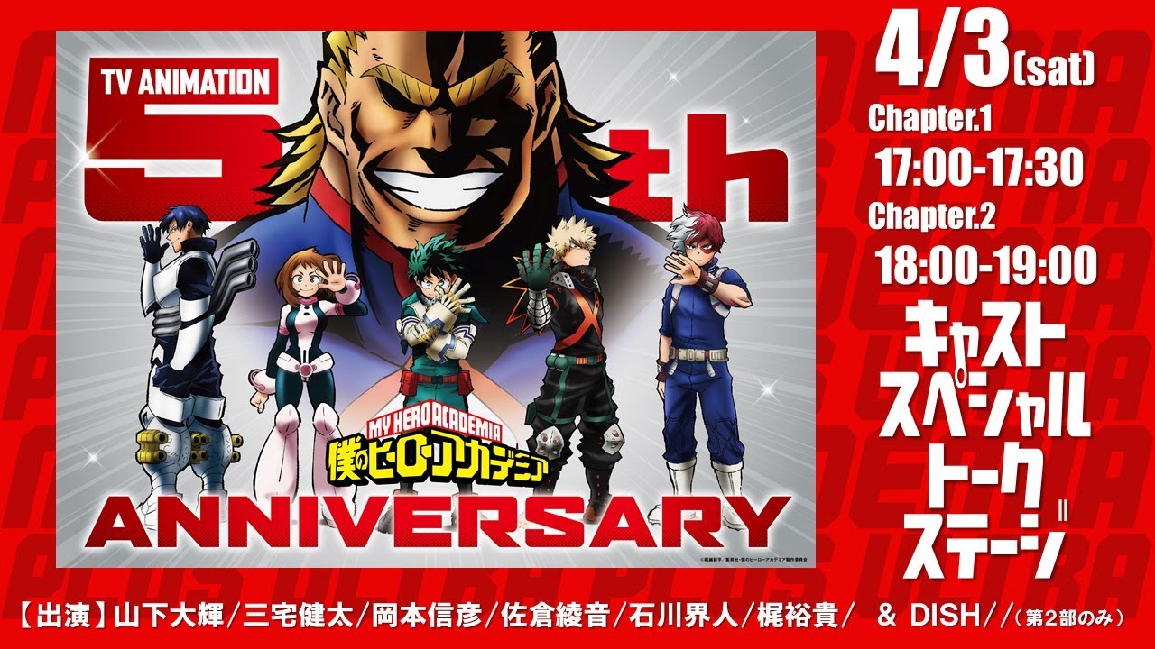 2016年4月3日の『僕のヒーローアカデミア』TVアニメ第1期初回放送から丸5年となる2021年4月3日(土)に贈る、ヒロアカアニメメインキャスト6名によるスペシャルトークステージを生配信!これまでのヒロアカの5年を振り返りつつ、絶賛放送中の第5期を盛り上げる!
