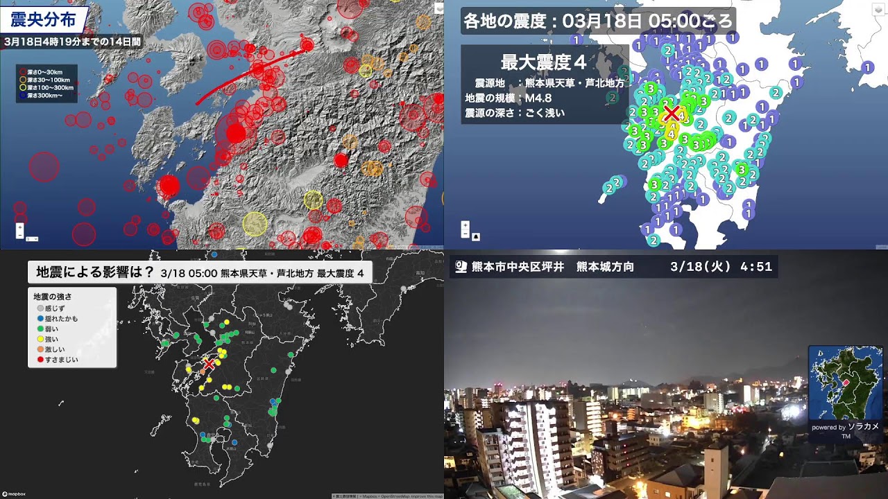 【4画面解説】熊本県天草・芦北地方でM4.8の地震 最大震度4 津波の心配なし