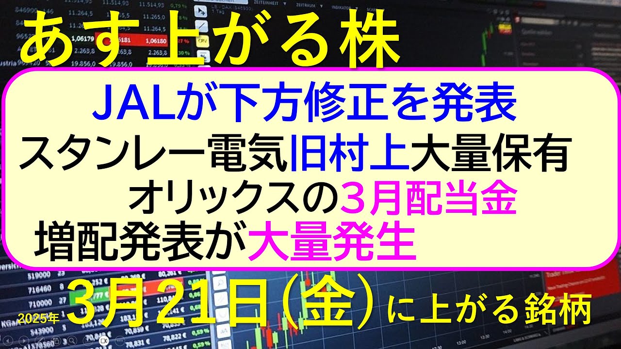 あす上がる株 2025年3月21日(金)に上がる銘柄。JALが下方修正。旧村上がスタンレー電気を大量保有。増配発表が大量発生。オリックスの3月配当金。~最新の日本株情報。高配当株の株価やデイトレ情報~