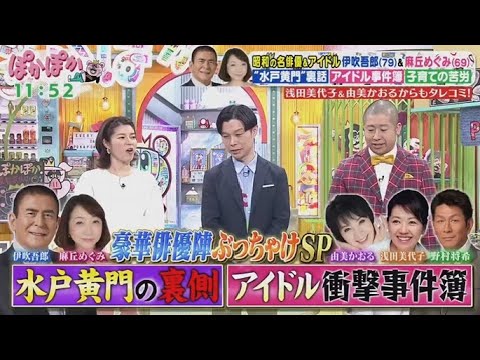 伊吹吾郎・麻丘めぐみ初登場▽昭和の名俳優が語る水戸黄門の裏話&麻丘が体験!アイドル時代の衝撃事件▽由美かおる・浅田美代子からのタレコミも▽正しく書ける?書き順Q