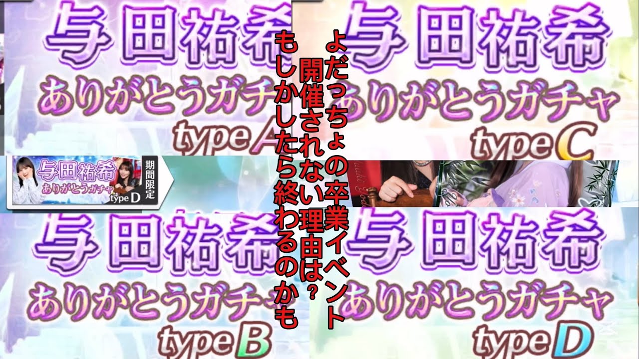 【乃木フェス】 与田祐希ありがとうガチャ type-A〜D 10連ずつ よだっちょの卒業イベントがない理由とは?ご視聴ありがとうございます!よだっちょの卒業イベントが開催されない理由がもしかしたら…… 考えられる理由とは? よかったらコメント・チャンネル登録よろしくお願いします👍 celebrity与田祐希乃木フェス
