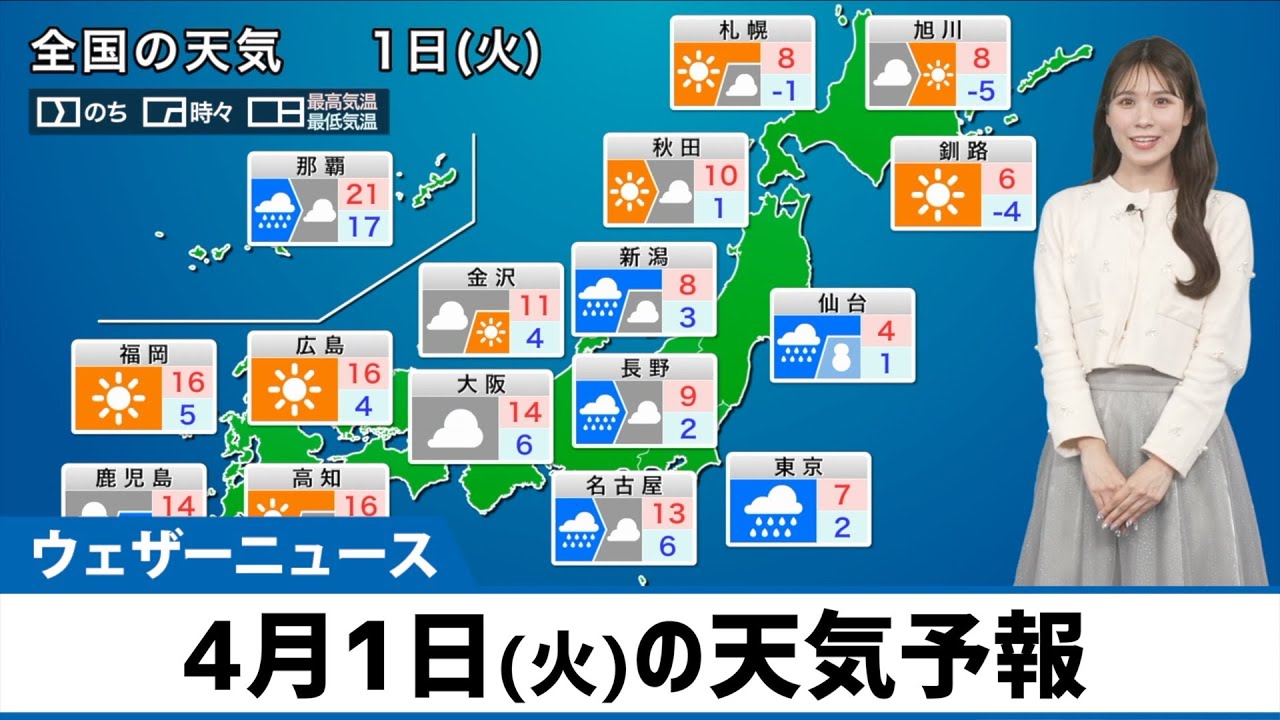 【4月1日(火)の天気予報】新年度初日は関東などで雨や雪 西日本や北海道は晴天