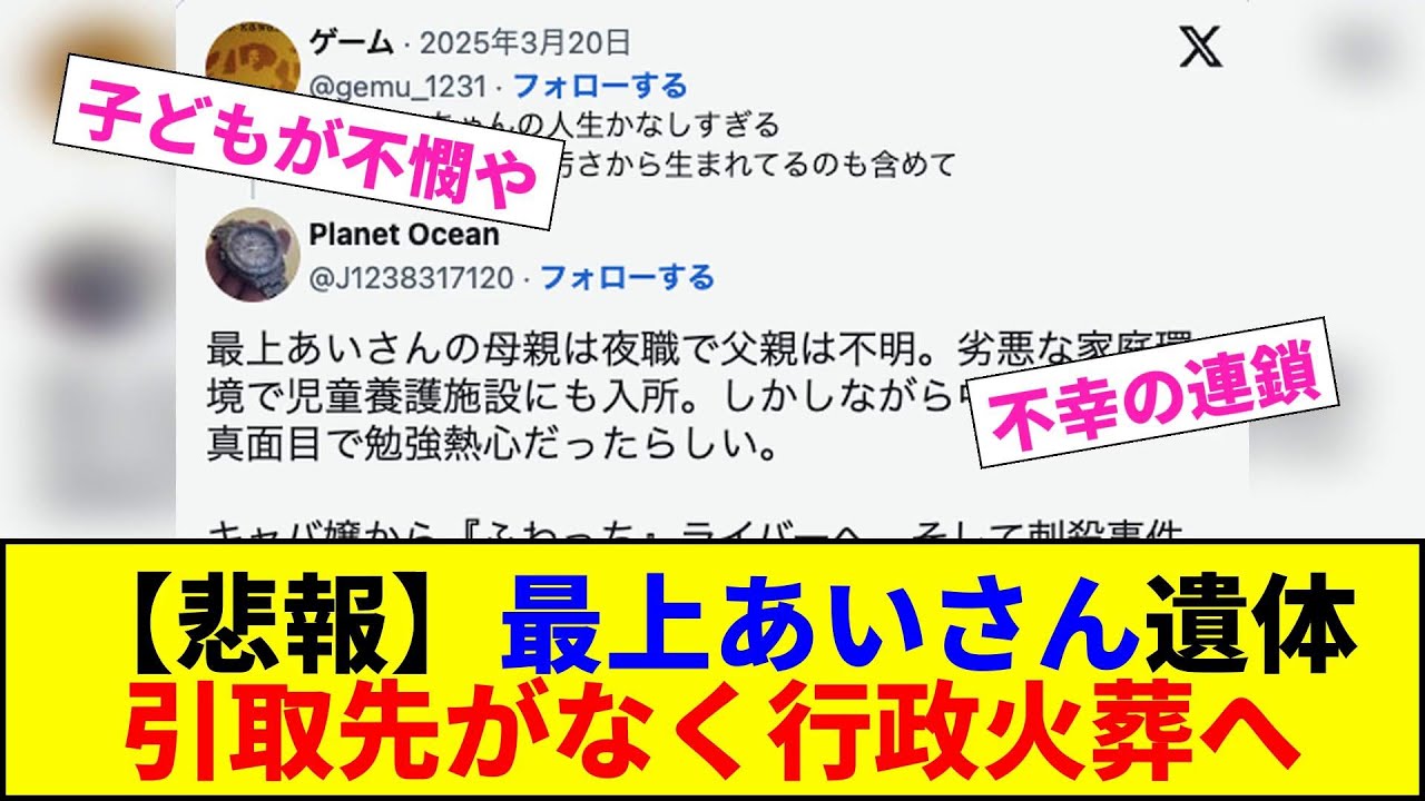 【悲報】最上あいさん遺体 引取先がなく行政火葬へ【2chまとめ】【2chスレ】【5chスレ】
