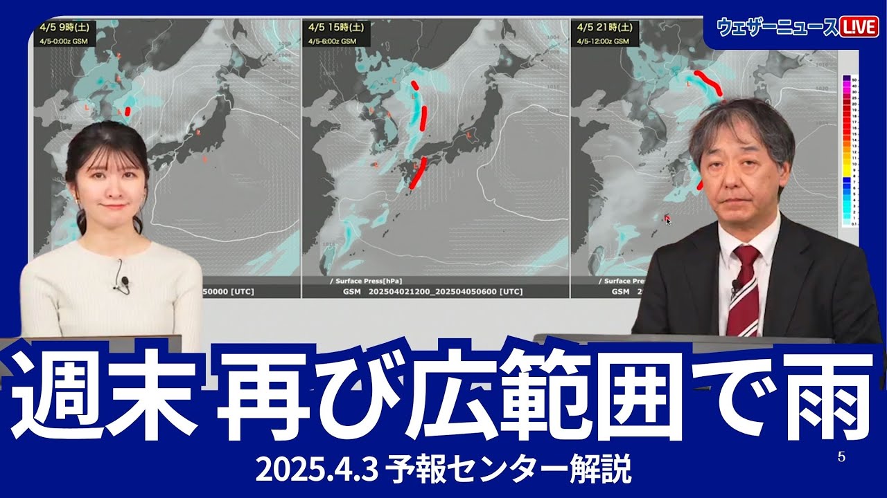 5日(土)は西日本で、6日(日)〜7日(月)は東日本や北日本で雨の降るところが多くなります。お花見を予定している方は雨のタイミングをよくご確認ください。